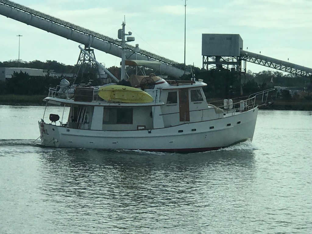 M/V Redtail (pictured below) appears to be a 42′ Kadey Krogen which is similar in size and style to our 43′ North Pacific raised pilothouse. Kelly and I love the classic lines of a Kadey Krogen.