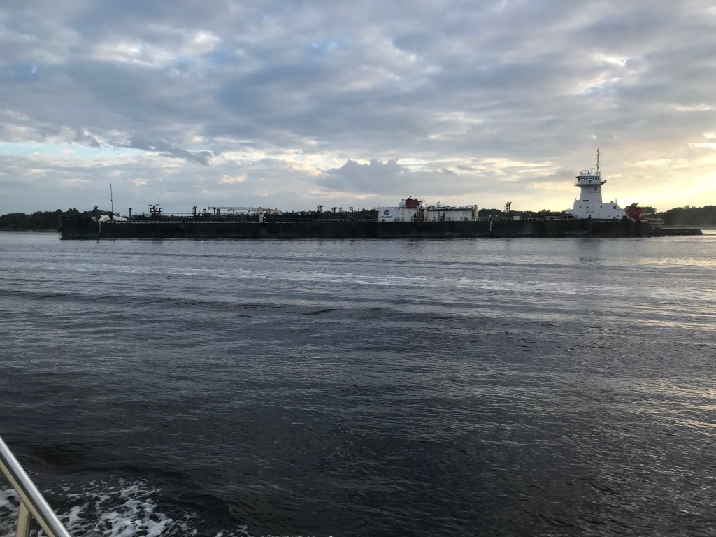 When we arrived at our planned anchorage, it was clear that it was far too narrow for us to be able to anchor in for the night. We pushed on and tried several other anchorages but they were either full like the free-docks in Jacksonville or just extremely exposed to current, wakes and wind. We made the decision to go up the St. John’s River as the sun was setting. I quickly realized that this was not a good idea when I felt the strong current that was running against us. There was also large commercial traffic moving swiftly down current. This tug and barge that hailed us by name before the captain ever saw us. The captain was able to do this because of the AIS (Automatic Identification System) that Kelly & I installed. You don’t want to be stuck in that current in the path of something like this when the current is pushing her hard at you.