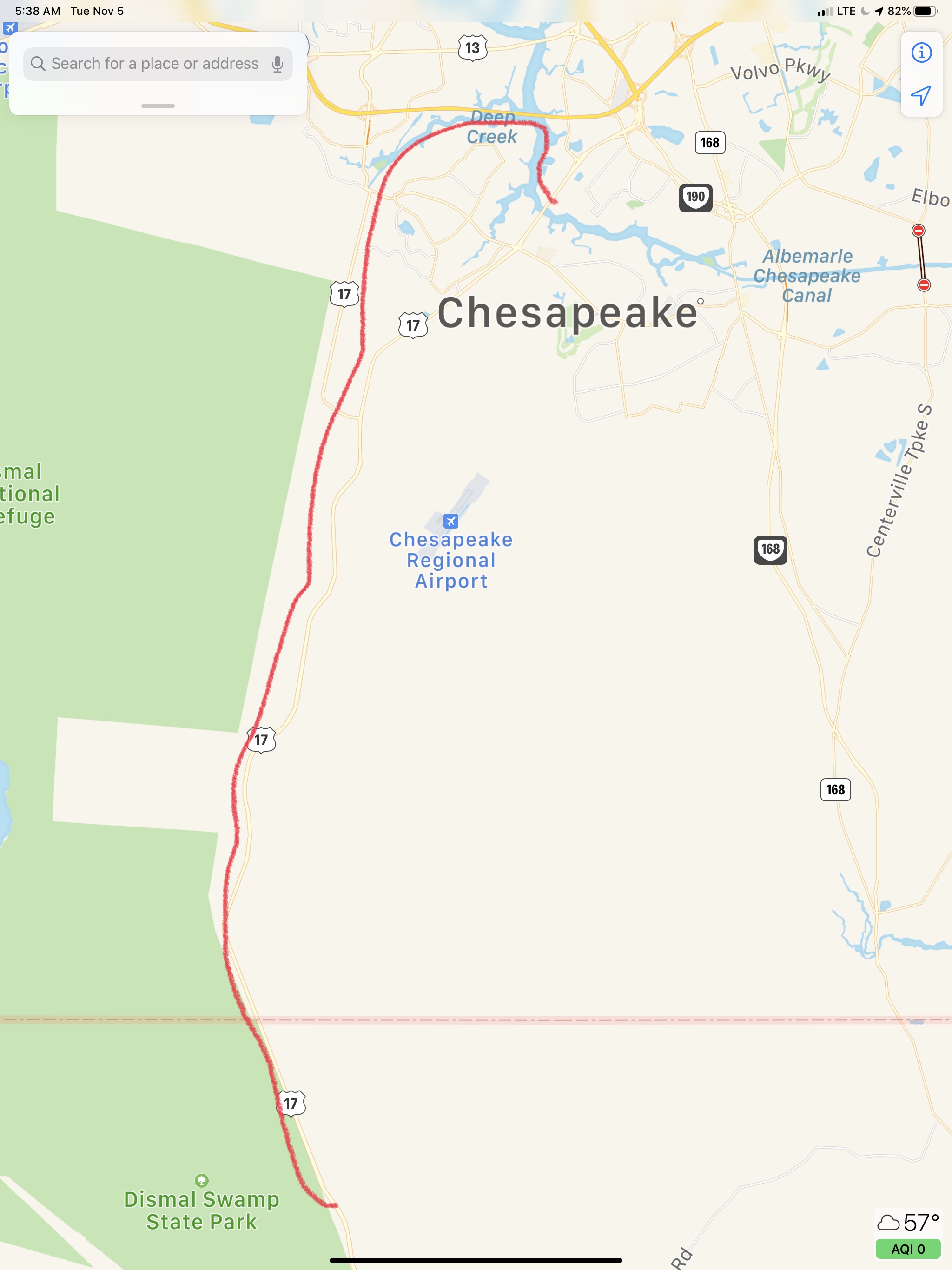 In the morning we turned north instead of south because we had to backtrack about a nautical mile to get back to where the ICW bifurcates between the Great Dismal Swamp route or the Virginia Cut. Most ICW cruisers chose the Virginia Cut route as it is the preferred route south.
