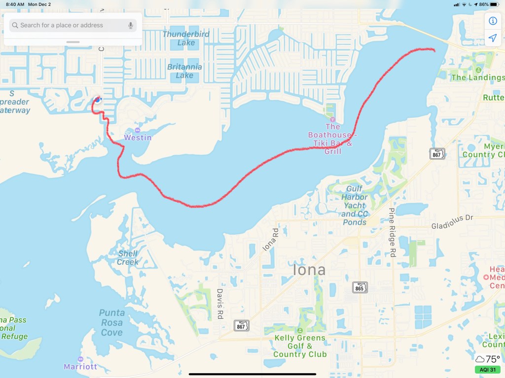 I untied the lines, jumped aboard and put her in gear. The pic above was snapped just after leaving Sunset Marina. You can see Dredger’s Key on the left iPad as well as straight ahead. You can also see that I didn’t get an early start (8:32AM).