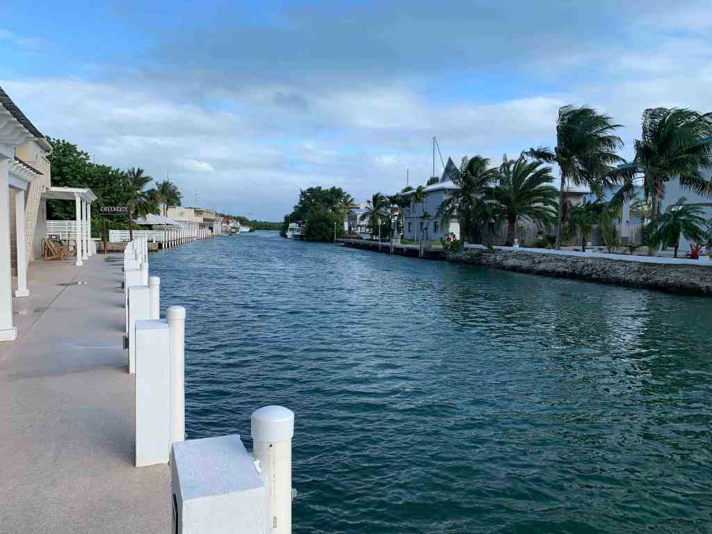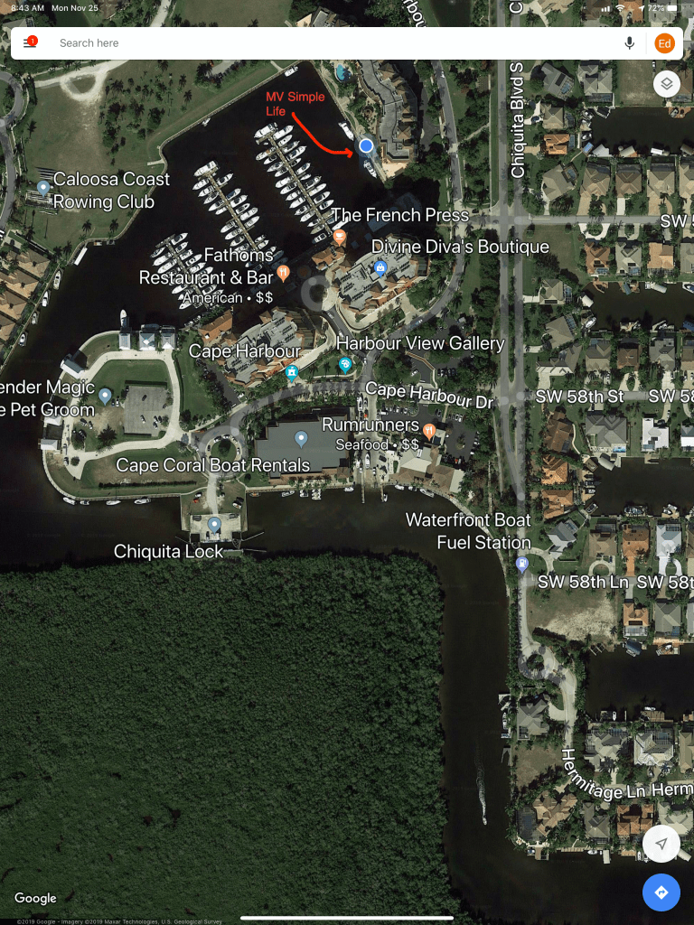 You can see from the satellite photo (below) that you must go by Rum Runners bar (next to the Tiki Bar near middle of picture) and through the Chiquita lock before turning to starboard to enter Cape Harbor Marina. Because the marina is behind a lock it is very peaceful as you don’t get any wave or wake action.