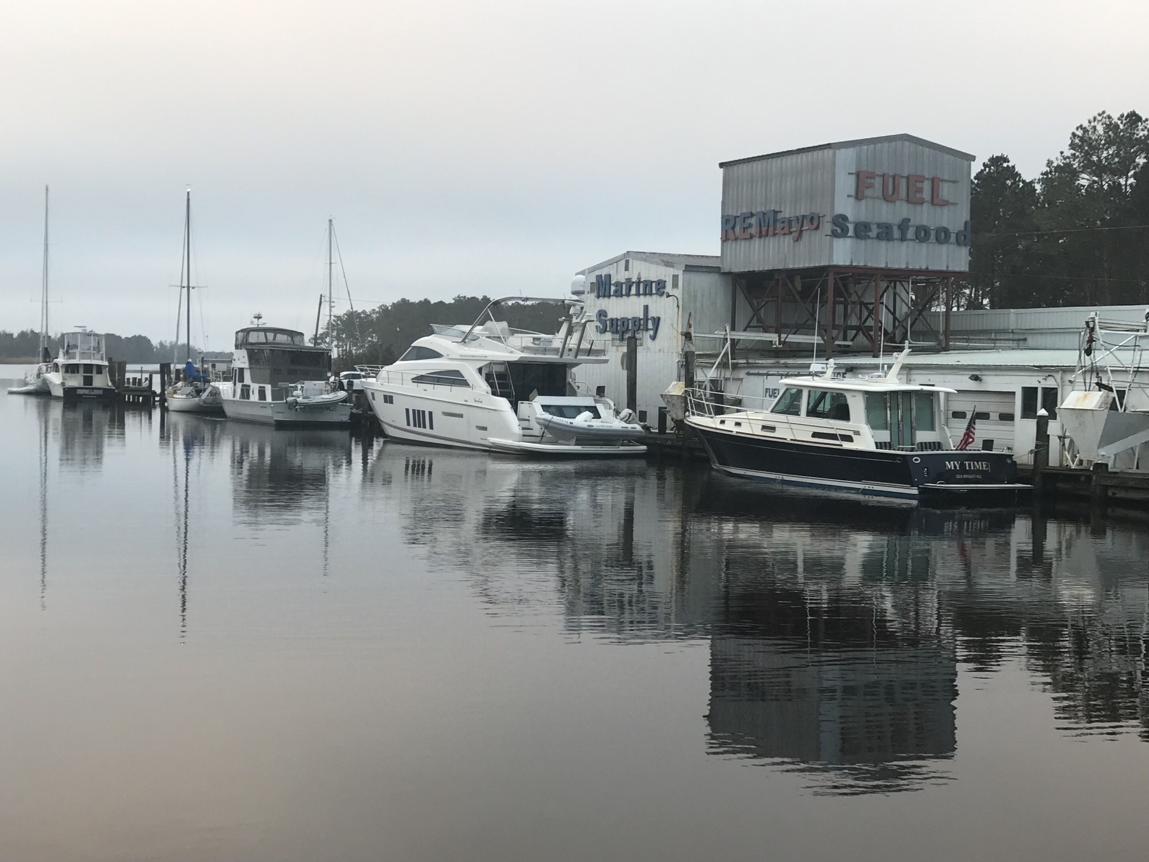 As I came into Swansboro I watched a USCG inflatable with three team members pass me and take up a course on my stern. Moments later they hailed me to tell me they wanted to board Simple Life. I cut speed to minimum make-way speed and explained that the best location to come along side and have crew jump aboard would be my stern swim platform. I felt only a slight bump and heard two Coasties coming through my salon. They greeted me warmly and asked if I was alone. I responded “yes” to which they replied … “oh, OK I guess you’ll have to keep piloting the boat and we’ll do our thing. They were doing a safety inspection which includes me showing them everything from sound devices, PFDs, throwable PFDs, signaling equipment, a digital copy of the USCG ColRegs. They also performed an engine room and bilge check as well as asked for my license and boat documentation. They were very professional and polite about searching through my current home. They gave me a passing grade and handed my my yellow boarded slip to keep for my records. I asked if I could take a picture for my blog and they said “No Problem”.