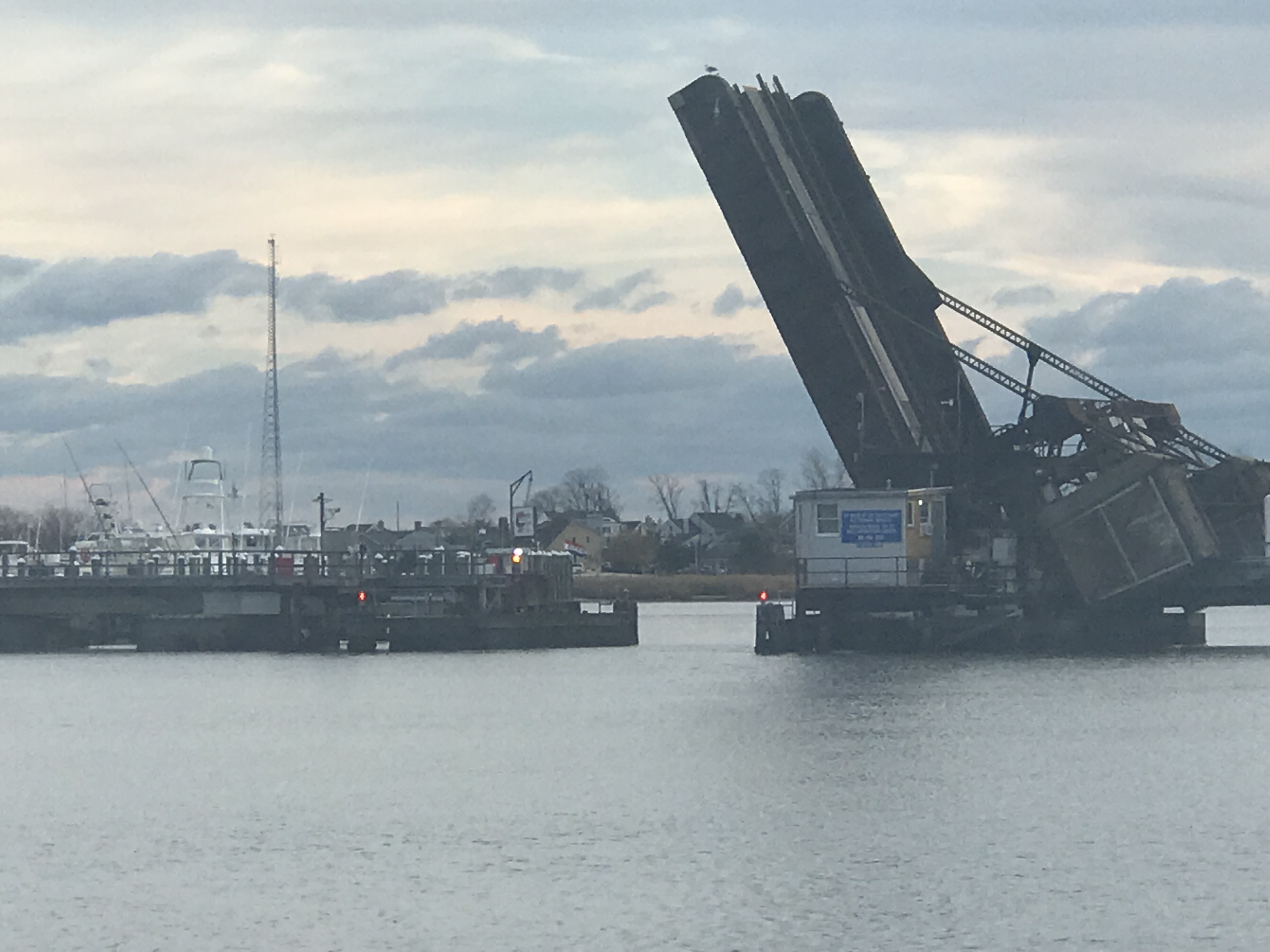 I need to be at Top Rack Marina before 5PM to get a slip. So when this huge barge swings out blocking the channel, I find a safe way around it and under the bridge.