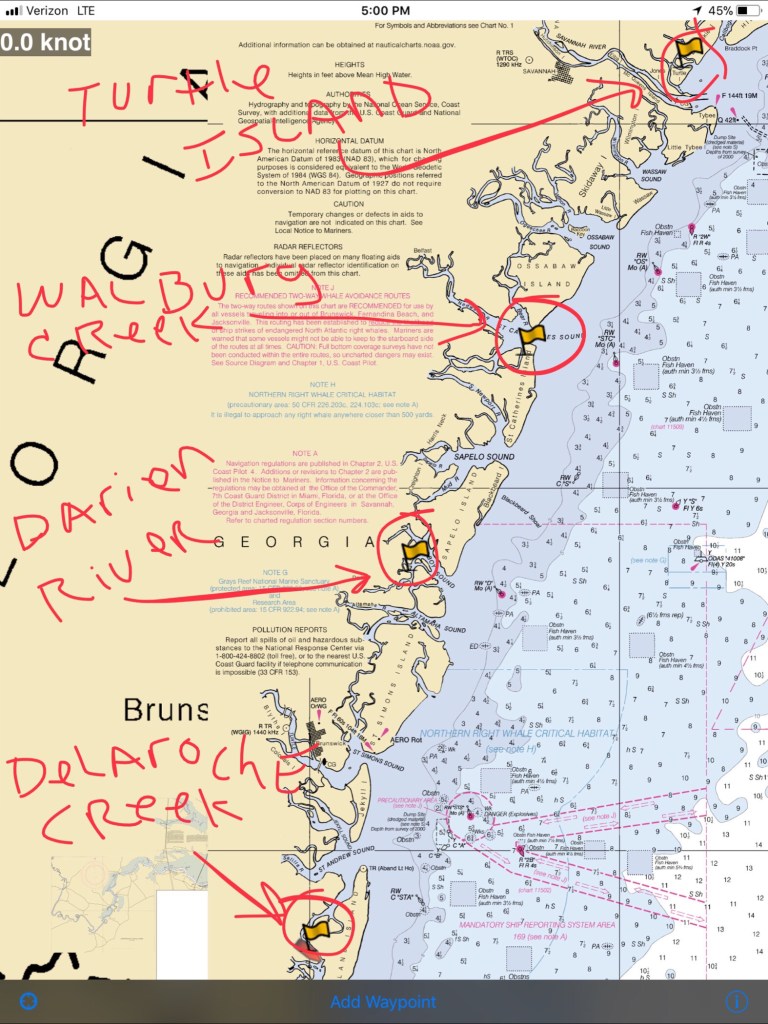 Last night’s anchor in the Darien River was a bit wider and lucky for that as the local Darien shrimp boats had to squeeze by us.
