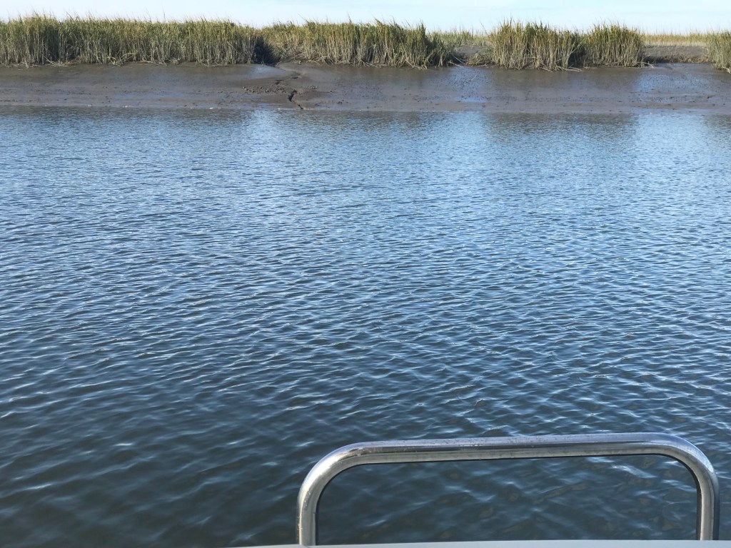 The towboat captain was quite friendly and chatted with us on the VHF for a bit. He warned us about the upcoming shallows in Jekyll Creek that goes around Jekyll Island. He was not wrong. We were approaching simultaneously with low tide. We thought we might anchor before the worst of it but instead pushed on and made it past Jekyll Island to Cumberland Island further South. Tonight we anchored in Delaroche Creek about halfway down Cumberland Island. It’s a tight fit in here. I had to shorten the anchor rode more than I wanted to keep from swinging into the banks of the creek. I snapped a pic just to show how close the edge of the creek is in here.