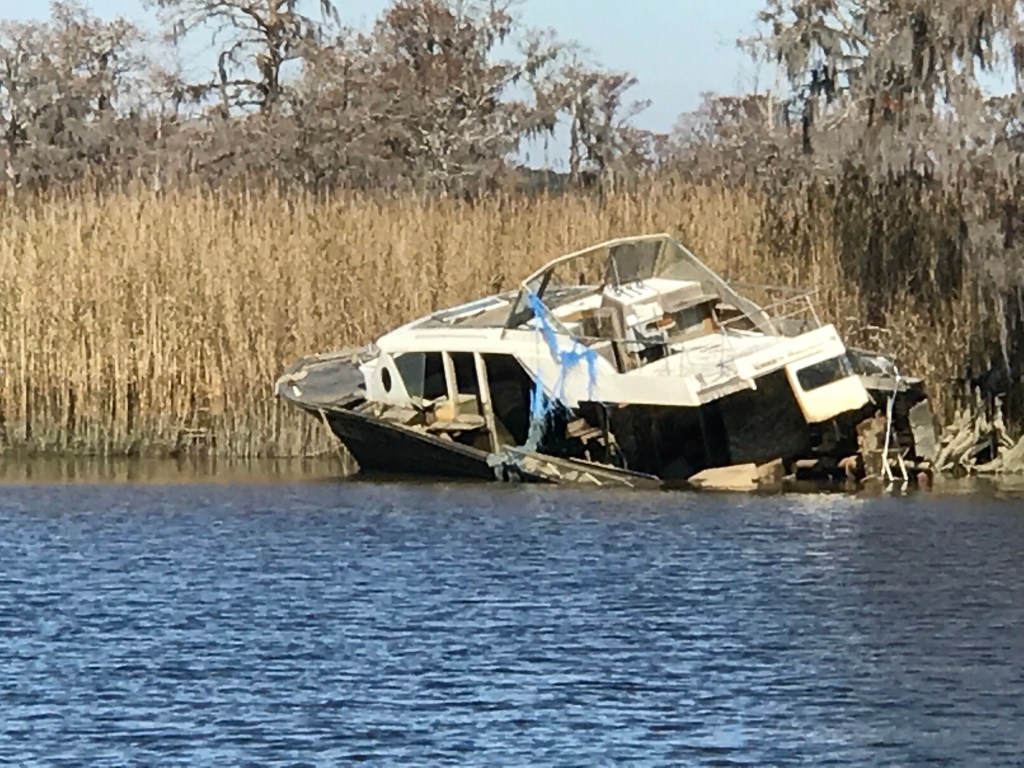 When the bridge opened we were again making way and passing what appeared to us as a collection of derelict boats anchored along the river. The boat below appeared to have someone on board due to the attached dinghy. I wonder how the state handles these anchored boats?