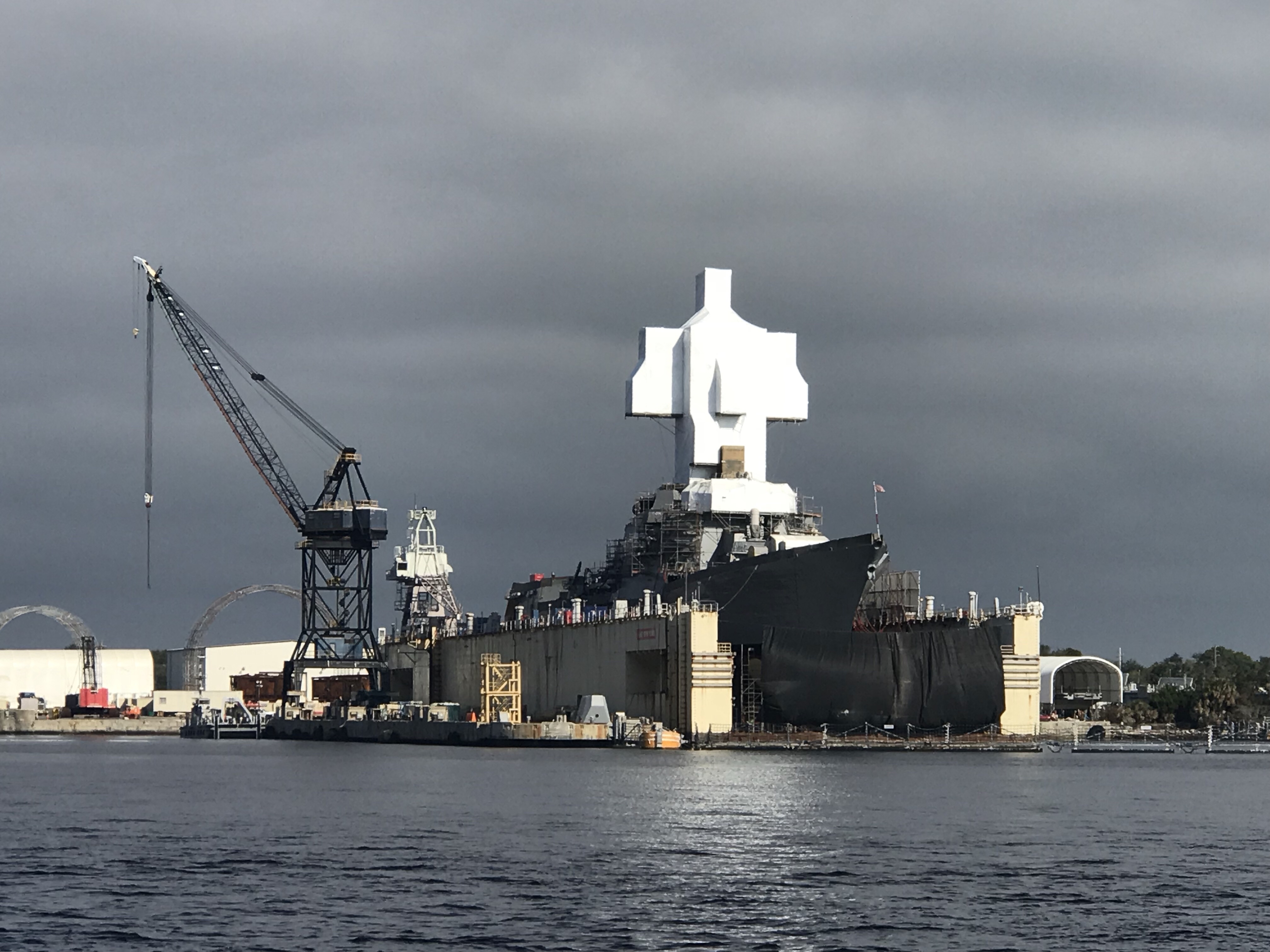 As we departed the St. James River and got back onto the ICW we saw a ship in dry dock that had it’s bridge tower staged and shrink wrapped. It looked a lot like the navy vessels that were being worked on in Norfolk, VA.