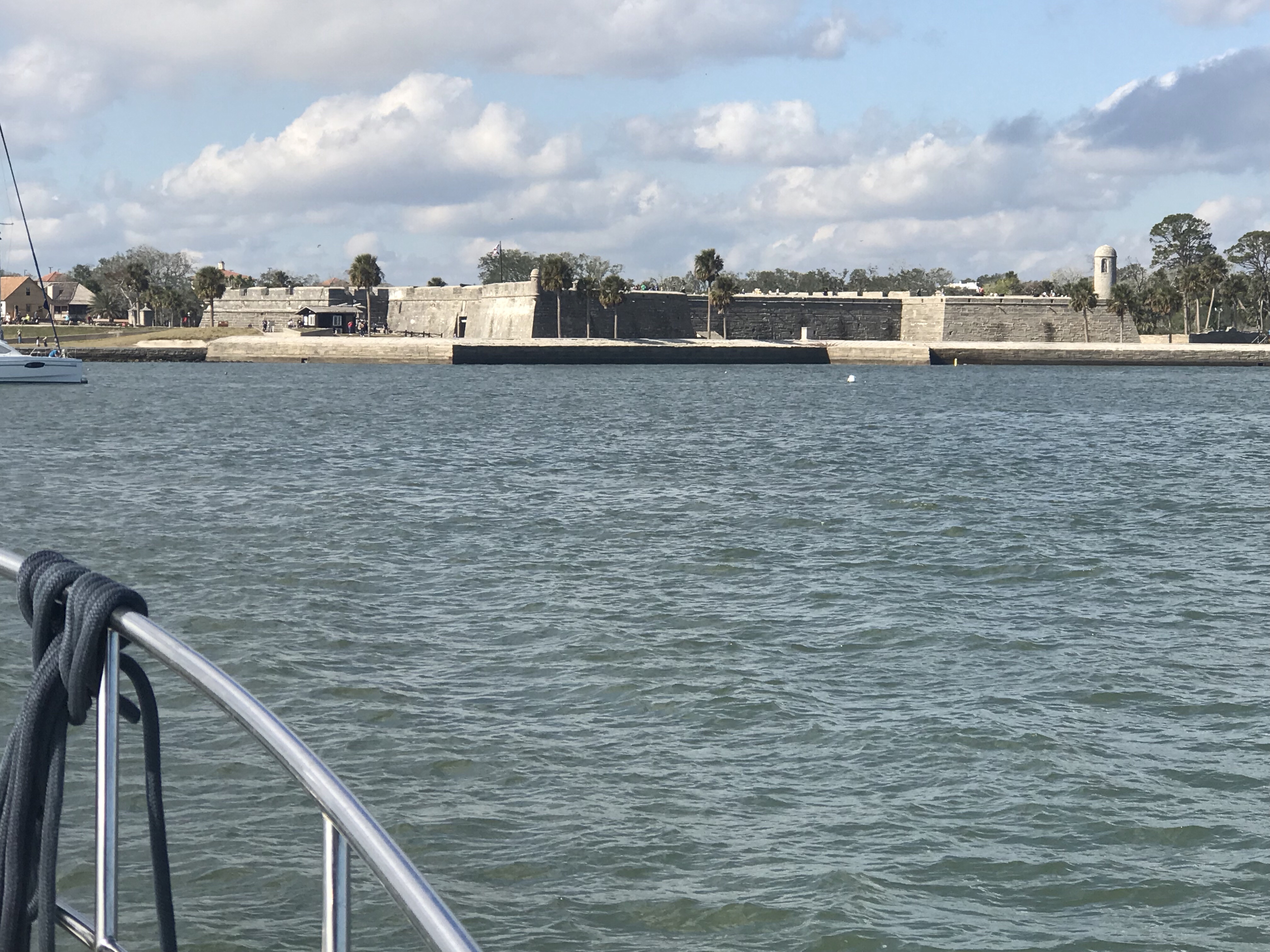 The next morning we re-provisioned the boat using a grocery delivery service. Kelly used her iPhone to place her order and set the delivery time the night before. We awoke to texts from our personal shopper texting us that she was on her way to the marina and and she would be the “girl in the gray Toyota”. After re-provisioning we spent the day taking on some more water and while Kelly cleaned the inside of the boat, I washed the outside. It was 80 something degrees out and seemed odd as Christmas is just a few days away. The next morning we shoved off and had no sooner started South down the ICW and we ran into a restricted bascule bridge and had to anchor for 45 minutes while we waited for it’s 12:30PM opening. Along the river bank you could see the fortress called Castillo De San Marco I snapped the picture below.