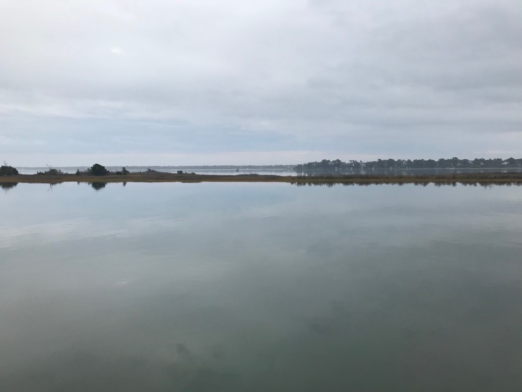 Bouge Sound is an East-West body of water trapped between main land North Carolina and a set of barrier islands. The sound has a narrow channel and marshy islands that abound. While the ocean was lumpy, Bouge Sound was a flat and reflective, like a mirror.