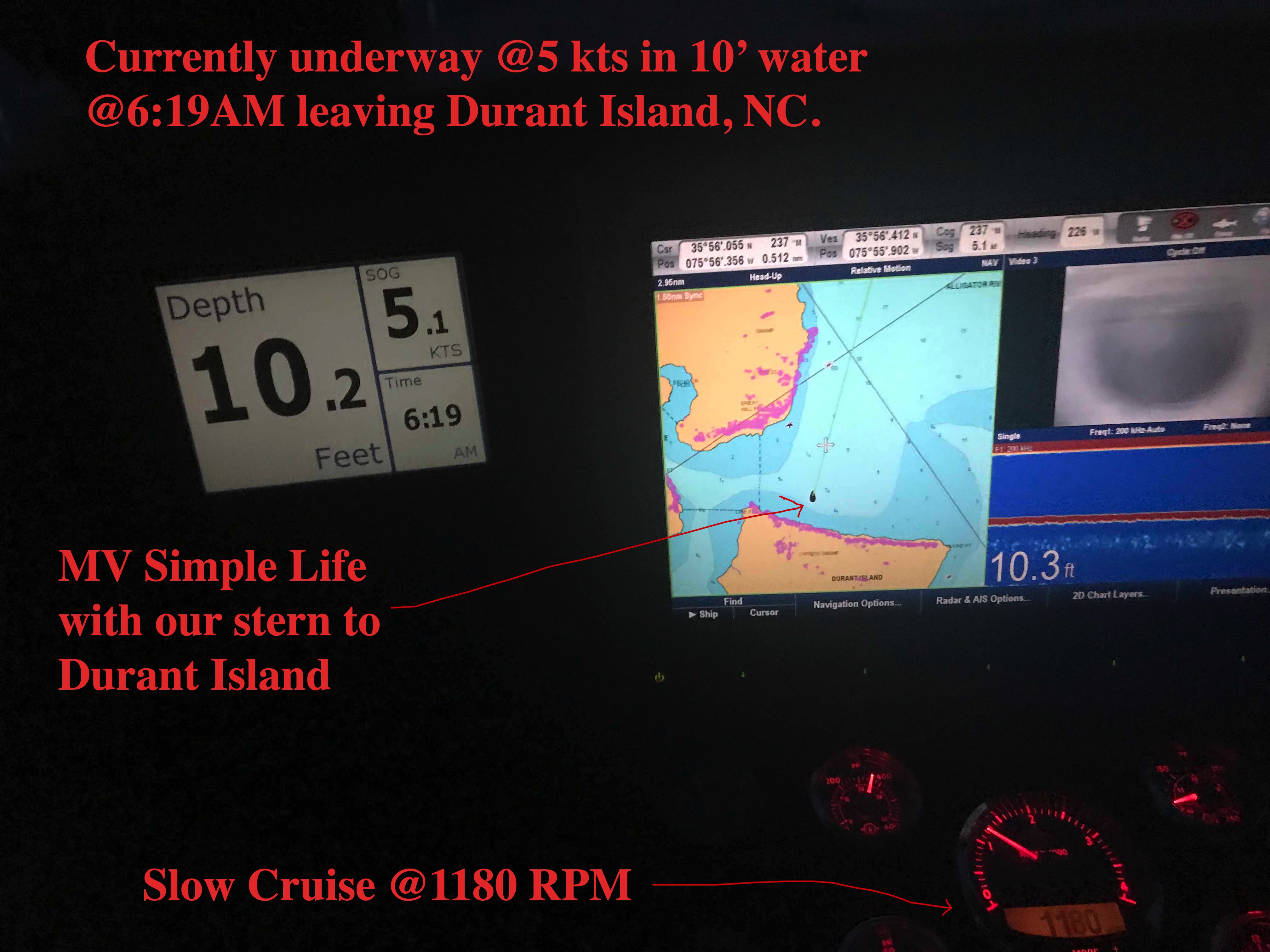 We continued South down the North River and into Albemarle Sound. There was not a single boat to be found in the sound. We had the crossing to ourselves. While approaching the mouth of Alligator River I saw, what I thought were boats but upon closer binocular examination, I see they are some sort of mini islands? I’m not sure of their purpose? They look to big to be duck blinds?