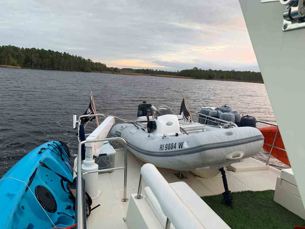 Last nights anchorage was peaceful. There was a light wind so we anchored far from the only lodge you can see lit up on the shore of East Lake, NC. I weigh anchor and do a loop around Effervescence IV.