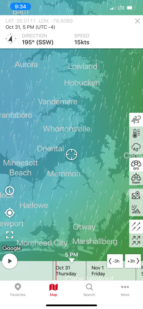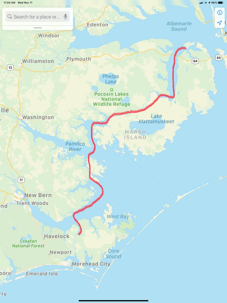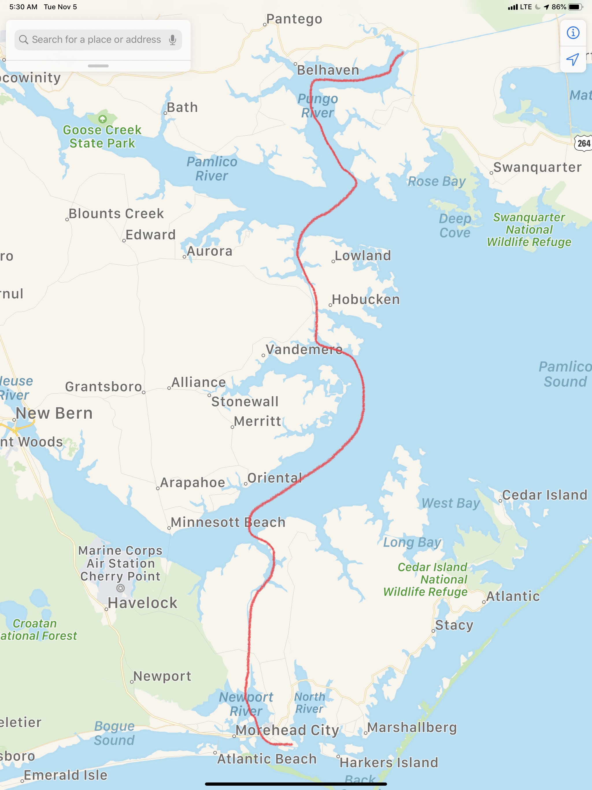 The planned route for today is to travel at Simple Life’s efficient 6.5kts which will put us in Gale Creek as the sun sets. If we anchor in Gale Creek, in the morning we will motor out of the creek and into the Bay River => Neuse River => Adam’s Creek => Core Creek = Newport Marshes => Morehead City, NC and then south down Bogue Sound.