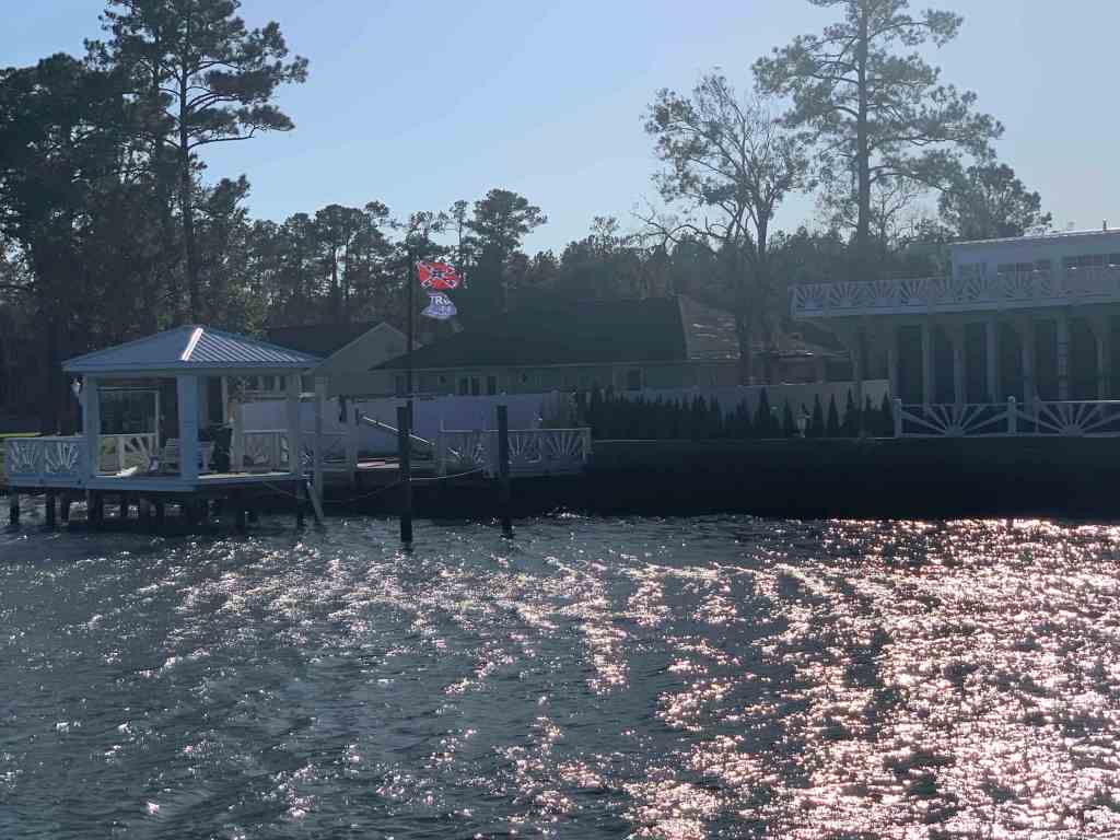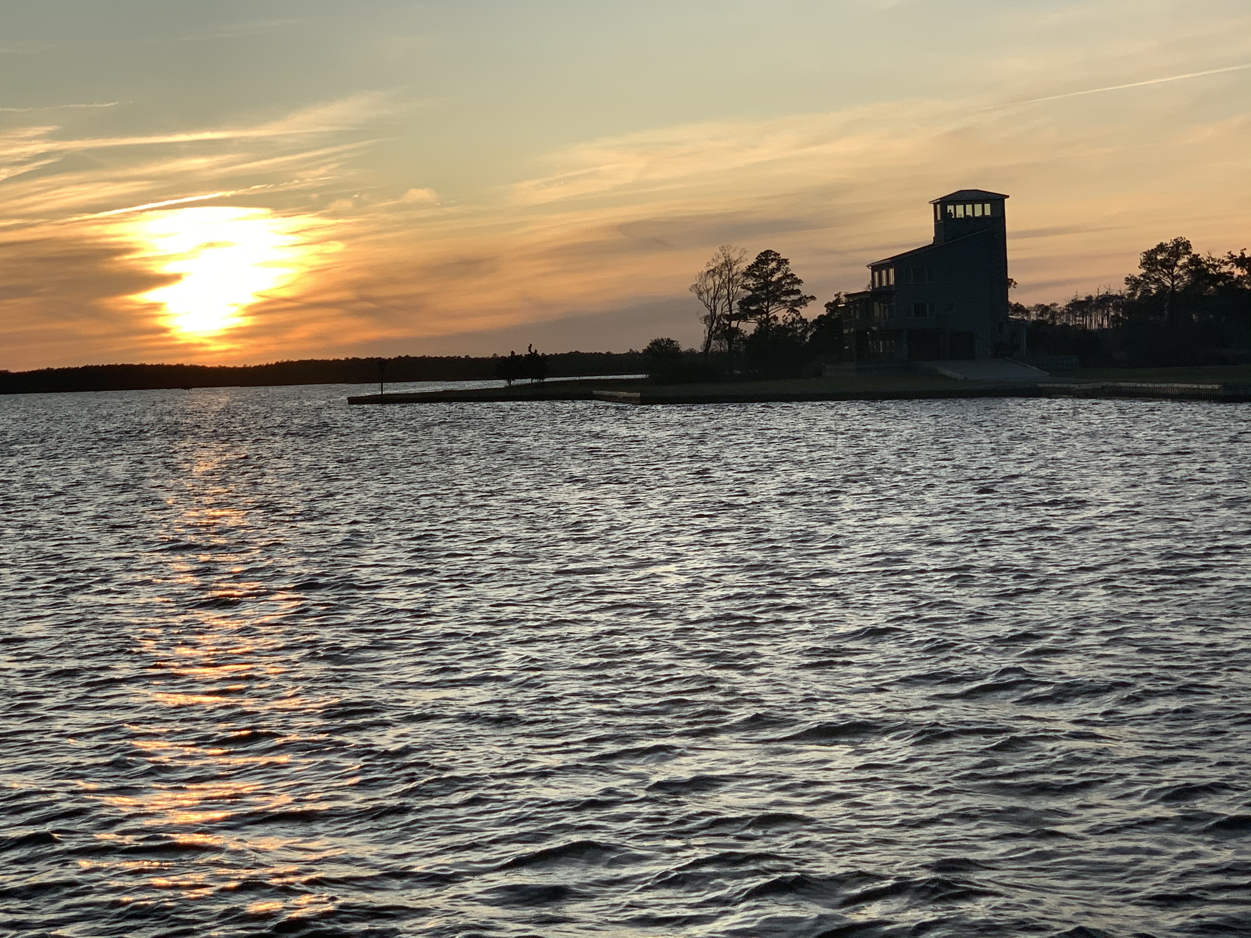I had to adjust my course a bit to avoid a beam sea as the winds blowing over Pamlico Sound have had a long fetch to build. Soon I am using my remote spotlight to spot pilings as I enter Adam’s Creek.