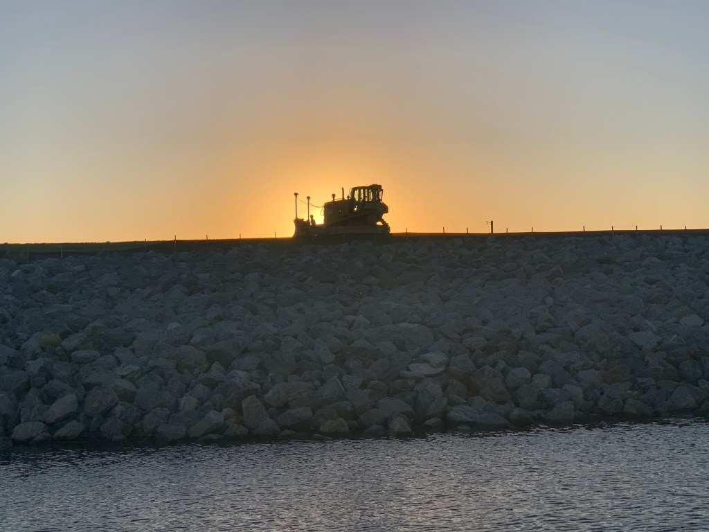 There are many construction vehicles on the dike. It appears as if they are increasing the height of the dike.