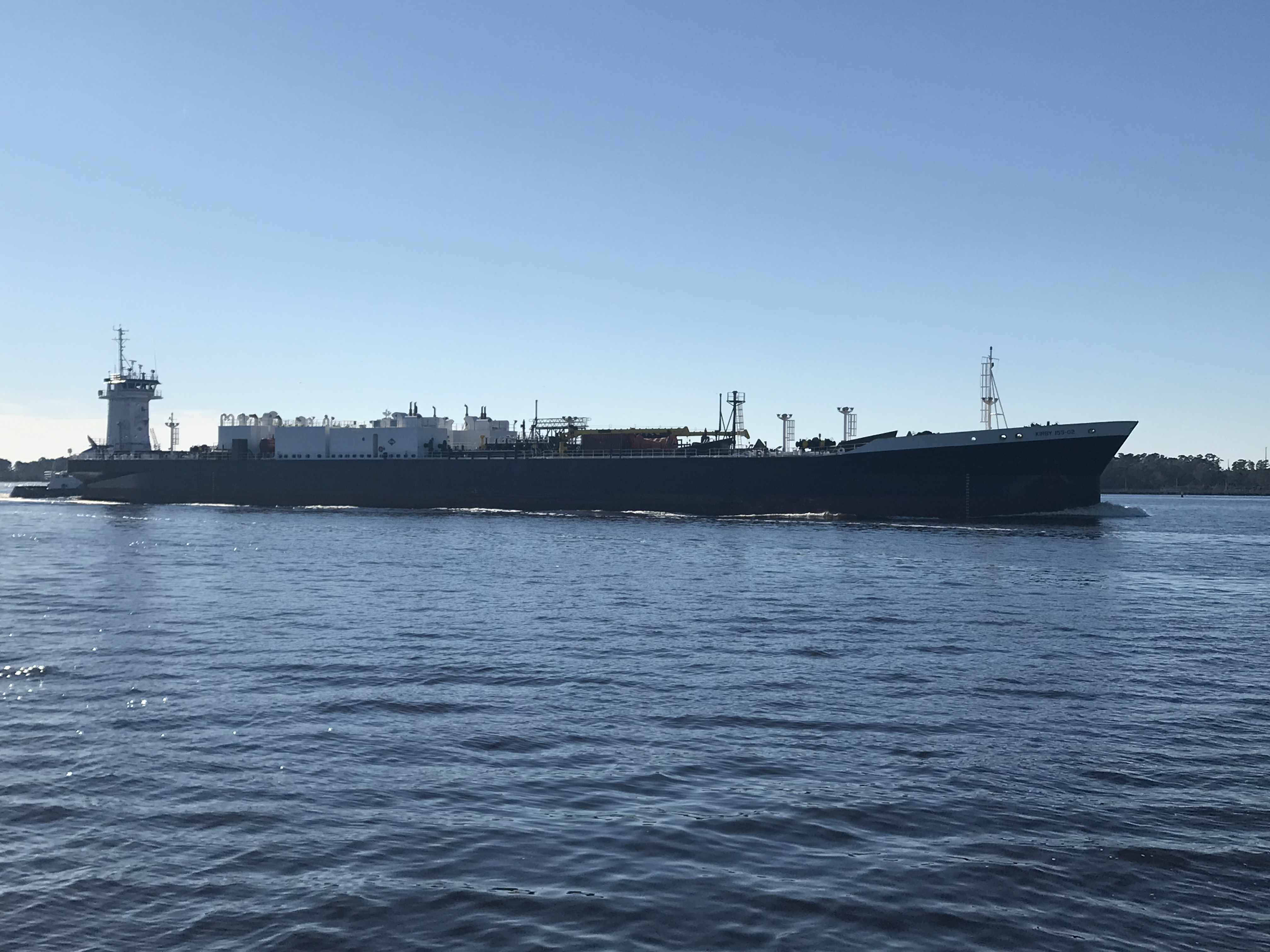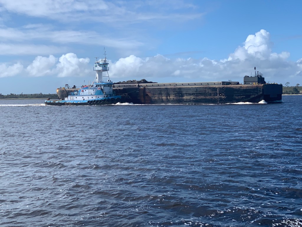 I pass a tug with a large barge on a hip tow.