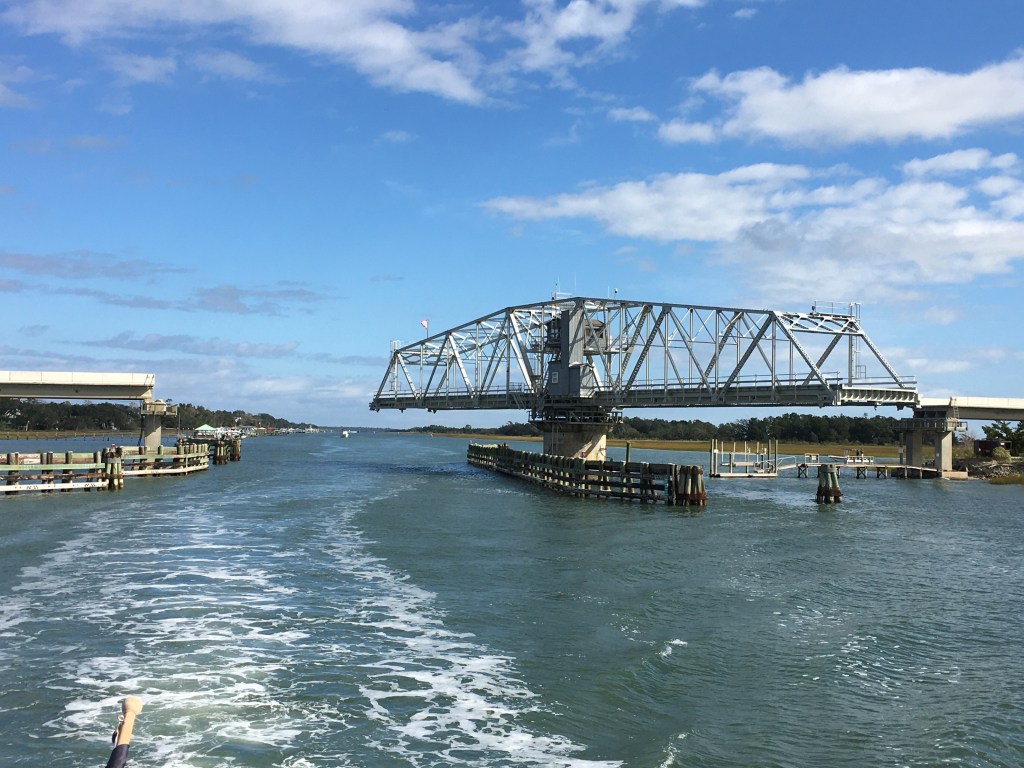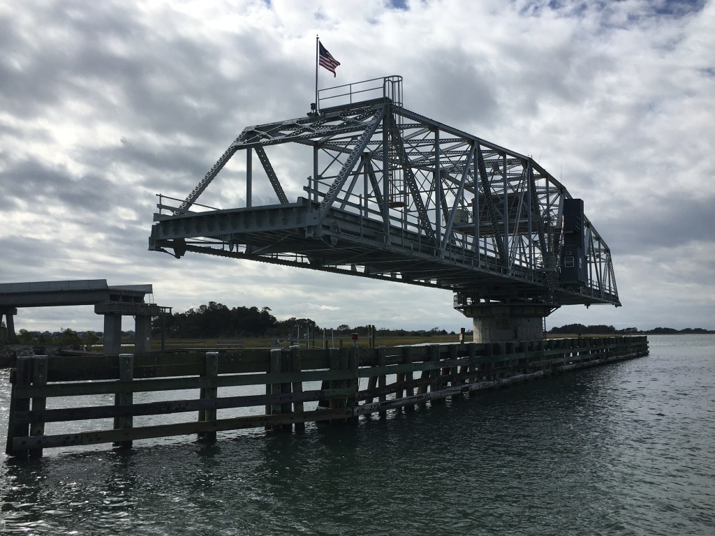 I am waiting for the opening of the Wrightsville Beach bascule bridge at the top of the 9th hour.