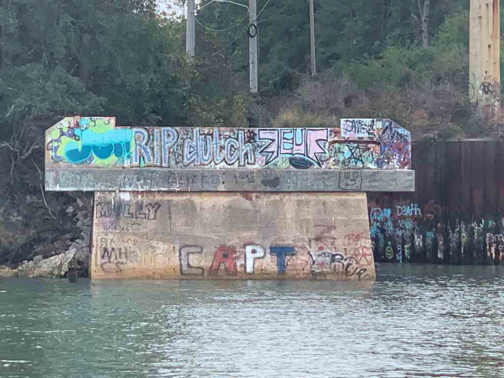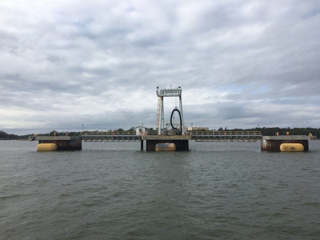 Snow’s Cut dumps you into the Cape Fear River and I am slowly passing a clam shell bucket dredge. Reminds me of that toy that little kids play with in the sand box.