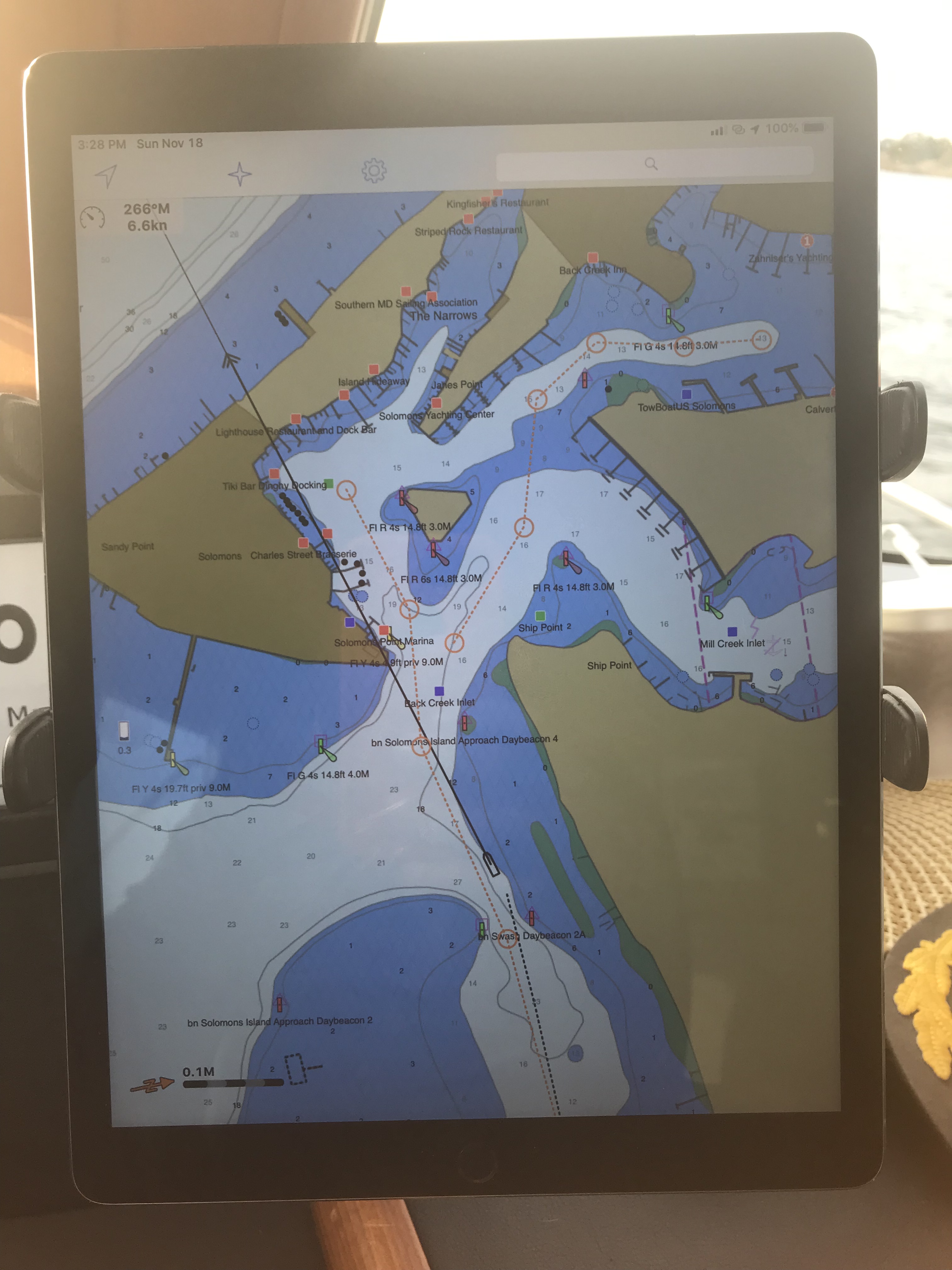 We shoved off from Annapolis and made a 6 hour 50NM run south to Solomons Island. Captain Teresa was at the helm for this trip south. It was great to sit in the 1st Mate chair and just relax as Teresa studied the route on the chartplotter and worked the helm to stay on course.