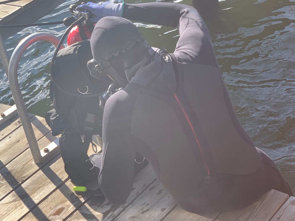 It made me nervous just to watch Jeff our diver jump into that water. When he entered the water he took quite a few loud deep breaths. It looked cold to me. Jeff disappeared for what seemed like 5-10 minutes as I watched his bubbles appearing on the surface up & down the dock. I stood there holding the line he had attached to the dock and himself. I finally gave a tug on the line (cuz I think I saw that in a movie once) and he came up empty-handed and cold. He agreed to try another spot closer to the stern of the boat and he was down another 5 minutes… He surfaced and smiled a frozen smile. He had me pull the rope and the door came to the surface. Jeff had felt with his hands in zero visibility around the bottom until he felt the metal door and rapped his dive rope around it several times. We had already turned the heat on inside MV Simple Life so it was 80 degrees inside. Teresa handed Jeff a steaming hot coffee and a towel. Judging by how he stood in the path of the heat with both hands clenching the coffee cup under his chin… I’d say he appreciated it.